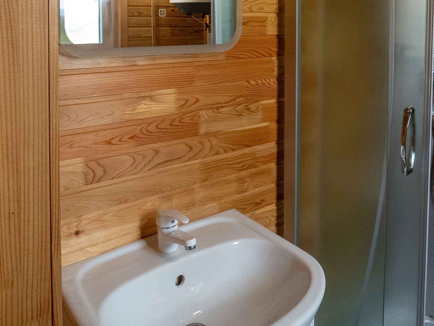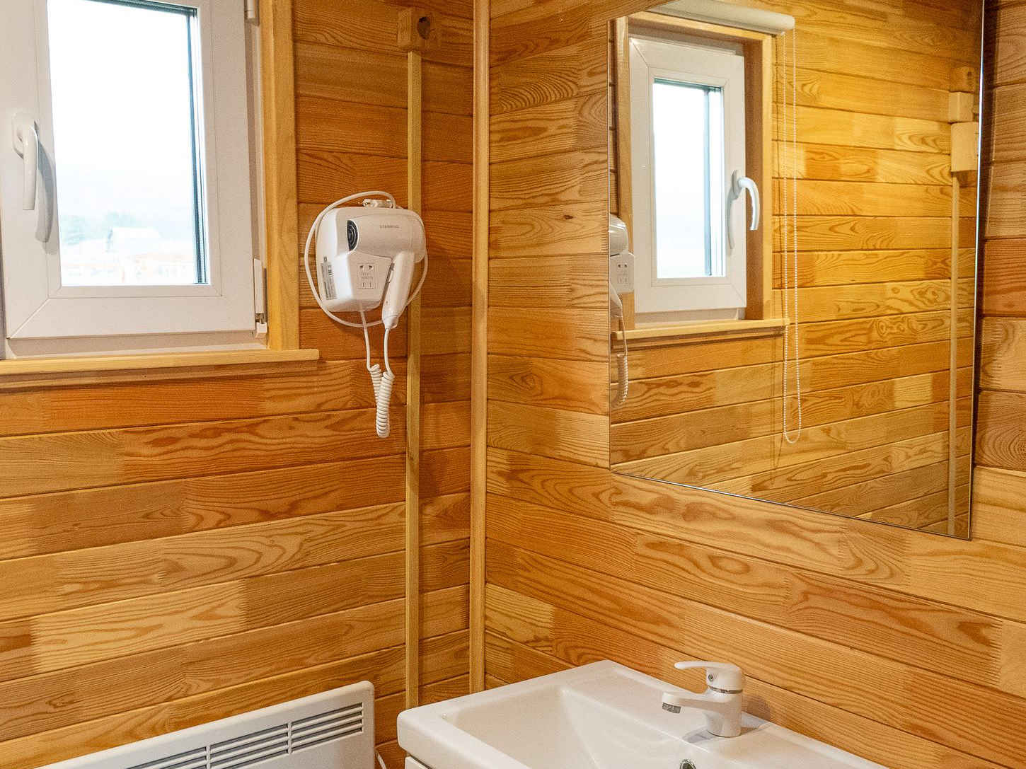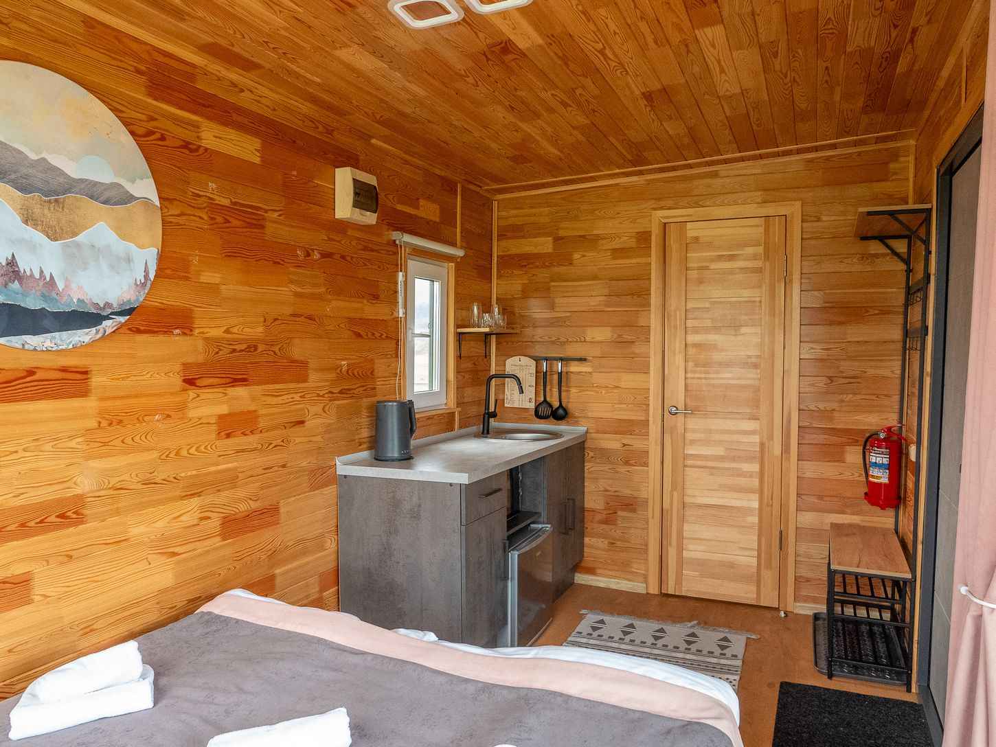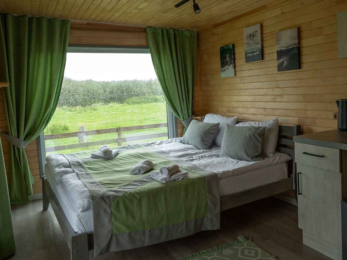 Это домики площадью 18 м², переоборудованные из морских контейнеров. Внутри — деревянная отделка, картины и необычные люстры. Окна расположены так, что из любого номера открывается вид на горы. По запросу гостям могут выдать дополнительное снаряжение, например сушилку для обуви.